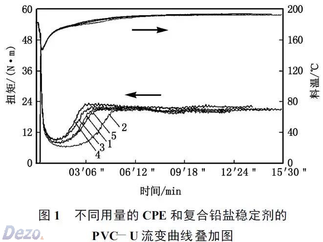 隨著CPE份數(shù)的增加,塑化時(shí)間縮短,說明CPE能夠促進(jìn)塑化。隨著穩(wěn)定劑的增加,塑化時(shí)間延長,因其含有外潤滑,增加穩(wěn)定劑的量,外潤滑劑的量自然也就增加。